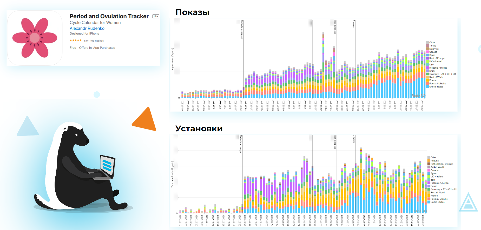 Много локализаций — значит работа на весь мир. Если вы работаете с рынком США и ничего не вышло, можно сделать еще 38 локализаций в App Store, и выстрелить в каких-то других странах. Вы не ограничены одни регионом, в то время как SEO-специалисты работают под одну страну. - Мы влияем не только на поиск. Мы также влияем на Browse (App Store) и Explore (Google Play). Эти установки идут через фичер подборки, топы категорий, «похожие» приложения. За счет того, что ваш трафик растет, конверсия улучшается, редактор может взять вас в какие-то подборки, ваша позиция в топе категории растет, и вы чаще попадаете в «похожие» приложения.
